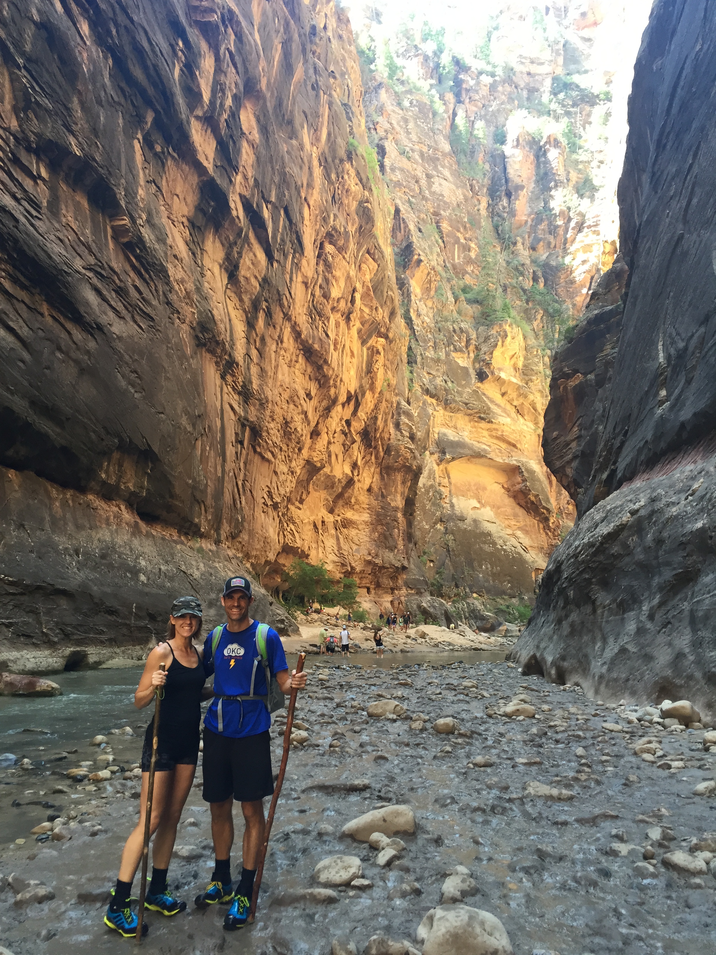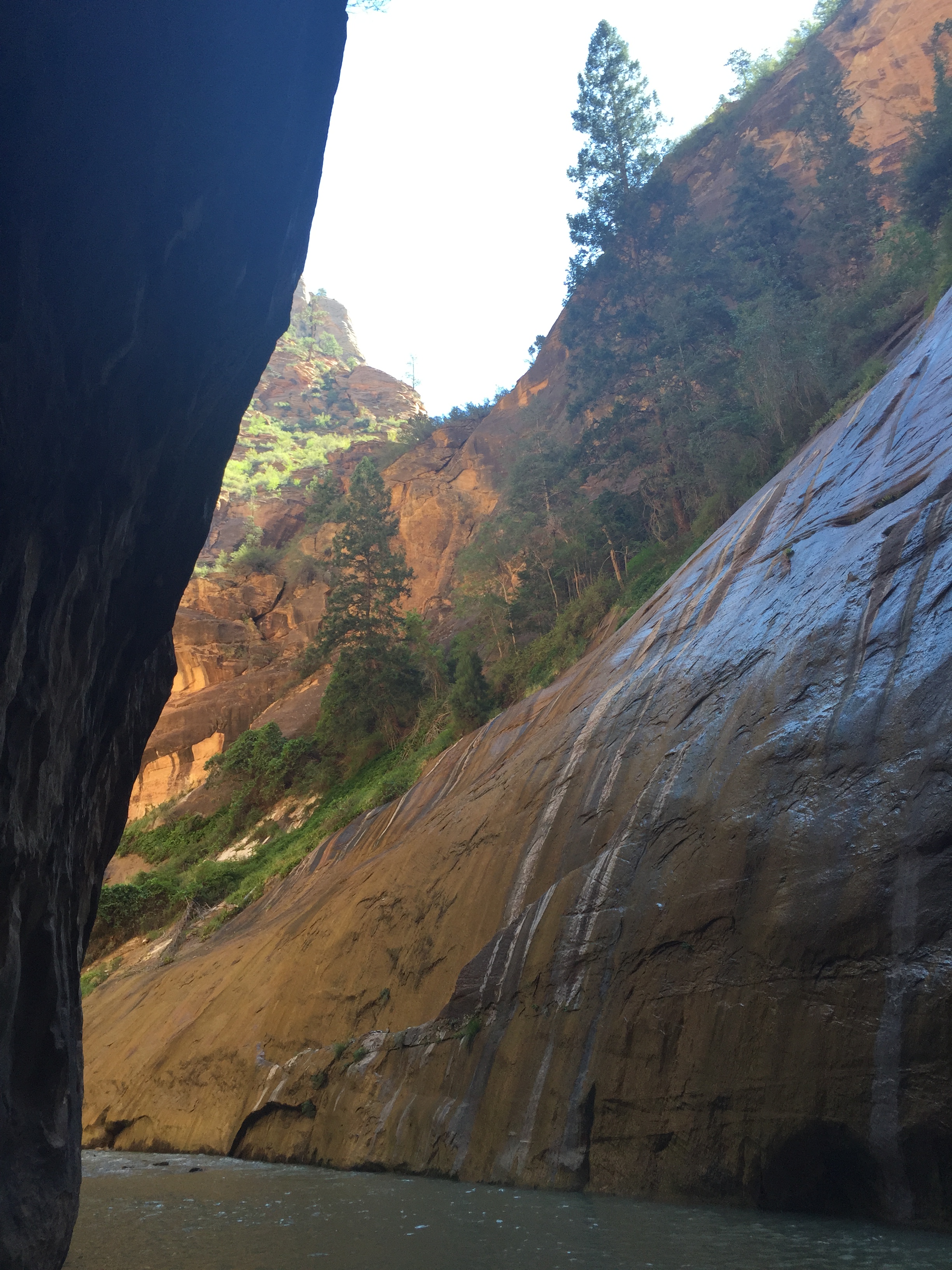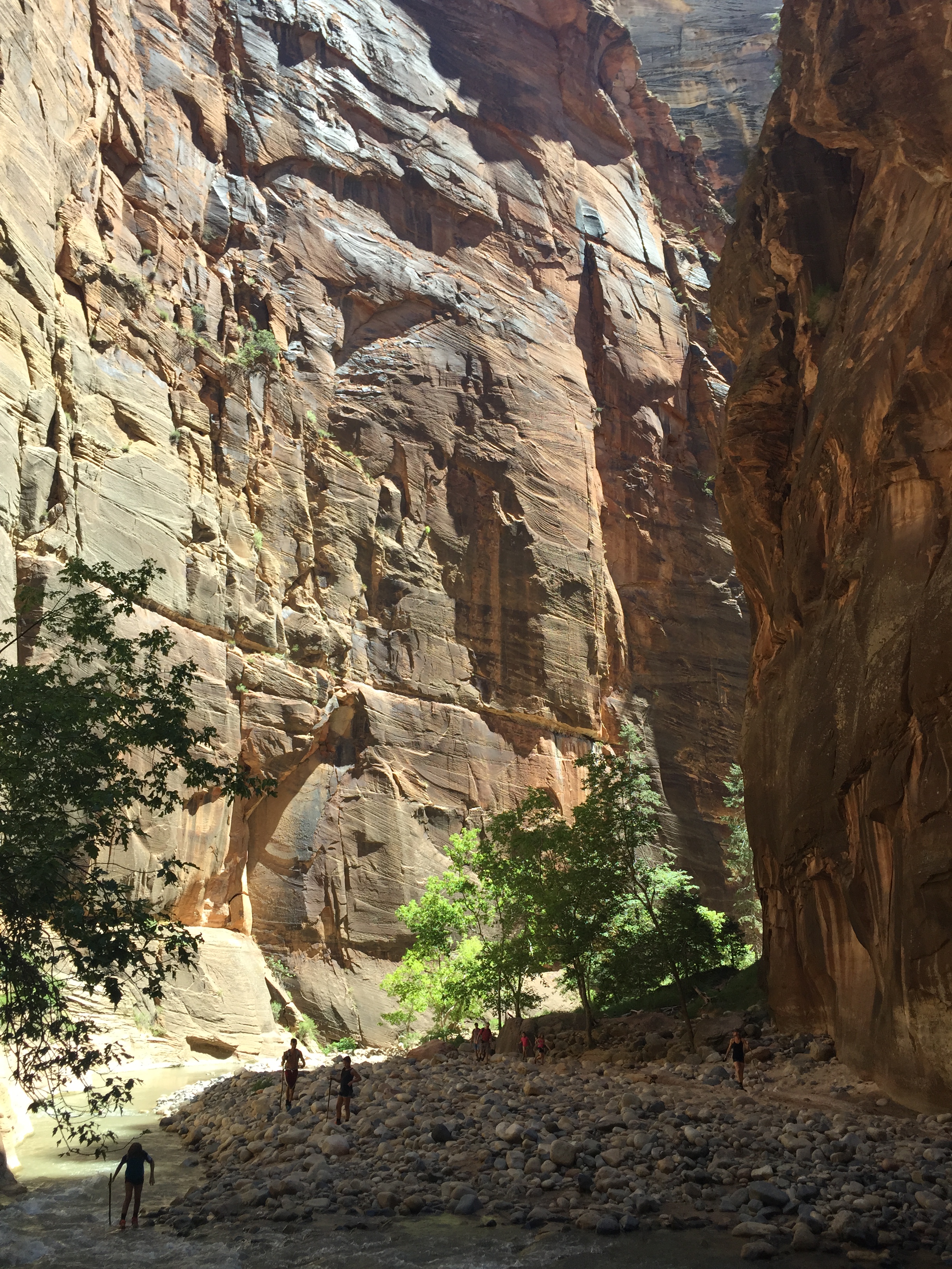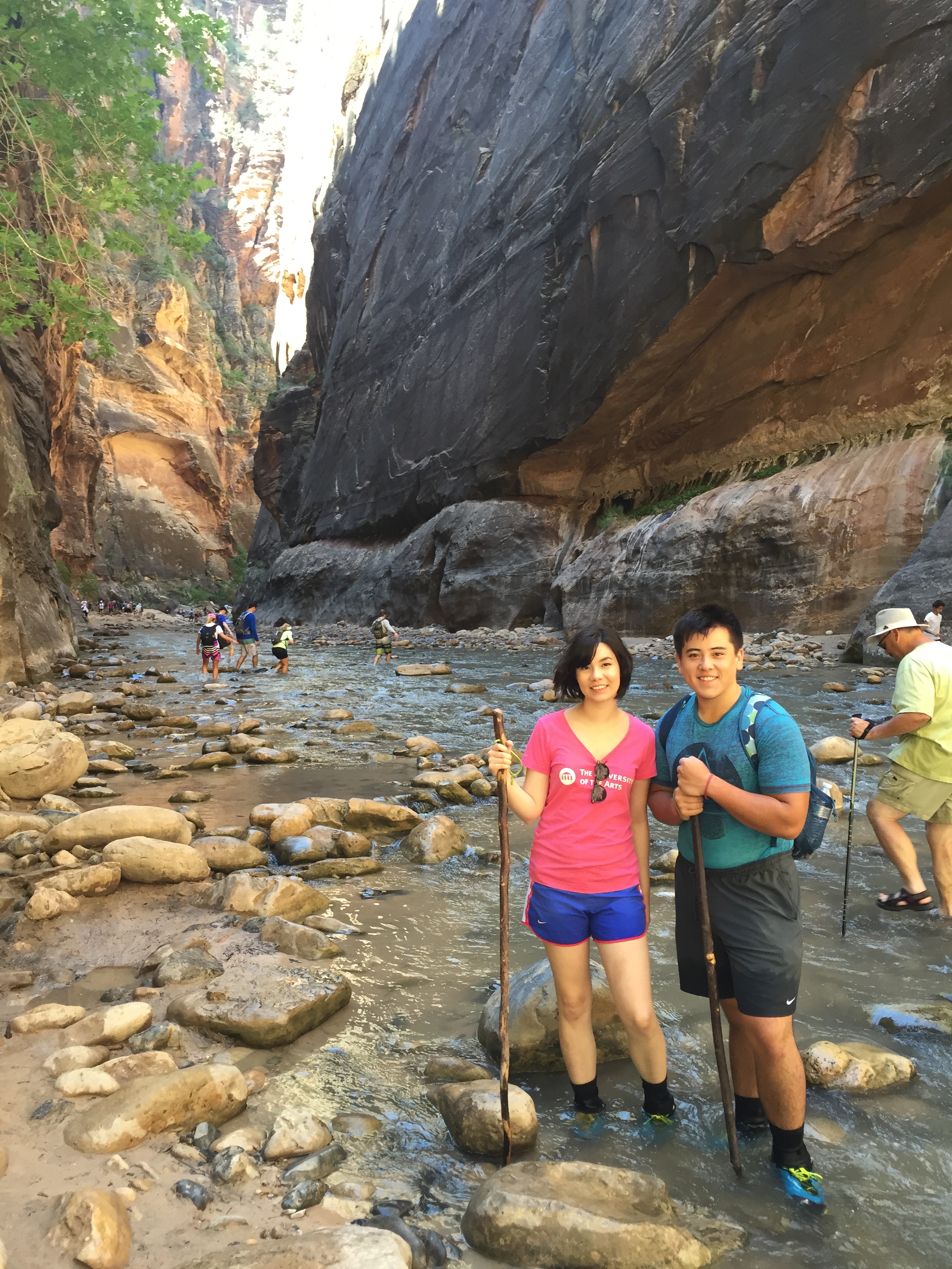 We rented water hiking boots and walking sticks for this hike at David’s insistence and we were all thankful for his stubbornness! Water was cloudy from so many people walking in it so we couldn’t really see what we were stepping on most of the time. Having these shoes with special grip and walking sticks to help our balance made things a little easier. We started out around 9 AM so it wasn’t terribly crowded going up the river buy by 12 PM, when we were coming back, it was packed.